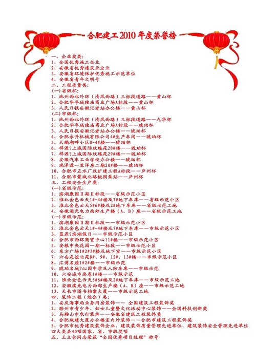 2010年度,合肥建工工程質(zhì)量、安全文明生產(chǎn)兩大類共獲獎項31項,其中,工程質(zhì)量獎項14項,工程安全生產(chǎn)類17項,實(shí)現(xiàn)合肥建工“創(chuàng)杯”、“創(chuàng)示范”的歷史新高。池州西北外環(huán)(清風(fēng)西路)三標(biāo)段道路、合肥華孚城隍廟商業(yè)廣場A標(biāo)段及人民日報安徽記者站辦公樓等工程榮獲安徽省建設(shè)工程質(zhì)量最高獎優(yōu)—— “黃山杯”獎。濱湖康園Ⅱ期Ⅱ標(biāo)段、淮北金色云天1#-4#樓及7#地下車庫、淮北金色云天5#6#樓及2#地下車庫,安徽濡光電力西郊生產(chǎn)樓(A、B)座等工程獲安徽省級示范工程稱號。
