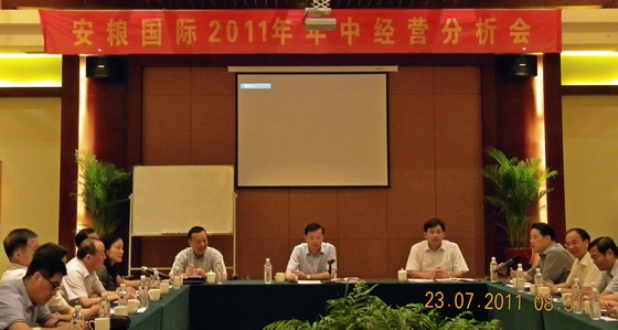 7月22日-23日,安糧國際2011年年中經營分析會在巢湖市半湯御泉山莊召開。安糧國際董事長朱亮、總經理曹訓立等公司高管,各部室主要負責人、直屬企業負責人等52人參加了會議。安糧控股副總裁葛志毅及職能部室負責人潘冬生、張來往、武義海、吳頎等出席了會議。