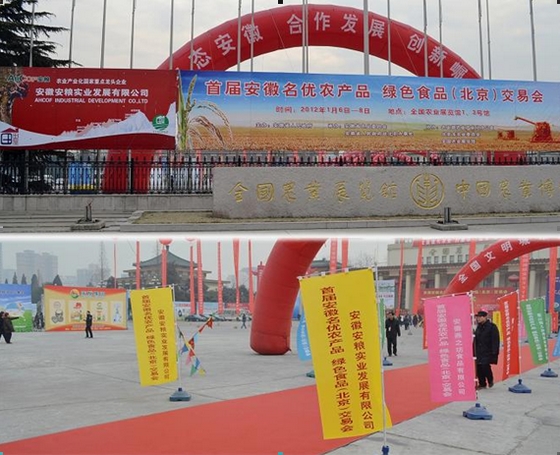 本次農(nóng)交會由安徽省人民政府主辦的,為期三天,其主題為“生態(tài)安徽、合作發(fā)展、創(chuàng)新崛起”,來自全省16個(gè)地市的優(yōu)秀農(nóng)產(chǎn)品企業(yè)以及省級農(nóng)民合作示范社共760家齊聚一堂。位于全國農(nóng)業(yè)展覽館正門上方的安糧實(shí)業(yè)大幅廣告牌以及廣場上印有公司名稱的彩旗格外引人注目。