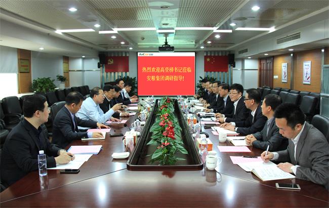 2019年5月9日,海螺集團黨委書記、董事長高登榜在國貿(mào)集團黨委書記、董事長范陽陪同下,來公司調(diào)研指導(dǎo),同行的還有海螺集團黨委委員、紀(jì)委書記吳小明,副總經(jīng)濟師、董辦主任周小川,組織人事部部長汪純健等。安糧集團黨委書記、董事長曹訓(xùn)立率集團(控股)領(lǐng)導(dǎo)班子全體成員參加調(diào)研座談。
