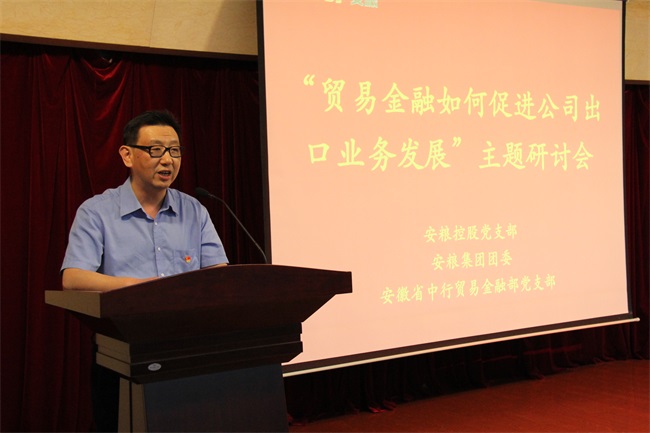會上,省中行貿(mào)易金融部黨支部首先從銀行角度介紹貿(mào)易金融促進(jìn)出口業(yè)務(wù)發(fā)展措施,重點(diǎn)介紹了中行國際結(jié)算業(yè)務(wù)優(yōu)勢、貿(mào)易融資產(chǎn)品、匯率避險(xiǎn)產(chǎn)品等。安糧控股黨支部書記武義海向與會人員解讀了貿(mào)易金融的基本概念、公司現(xiàn)行的出口貿(mào)易融資制度政策以及國家相關(guān)政策,并分享了公司出口貿(mào)易融資優(yōu)化案例,強(qiáng)調(diào)如何利用最合適的結(jié)算方式及融資避險(xiǎn)產(chǎn)品,達(dá)到結(jié)算風(fēng)險(xiǎn)最小化、融資好處最大化的目的。