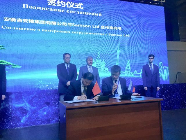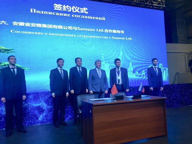 簽約儀式上,曹訓立董事長代表安糧集團與俄羅斯知名連鎖超市Samson Ltd.代表 Ilya Chekanov 先生簽署了雙方在深化合作擴大貿易額、電商業務的拓展以及Samson公司為安糧集團橋接當地資源向中國進口的戰略合作意向書。