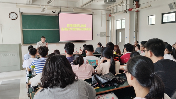 活動期間,安糧控股黨支部書記、國際結算總監武義海講授了進出口貨物貿易簡化流程、相應的理論與實務專業知識,分享了準備階段、交易階段、履約階段和收尾階段一些實務案例。來自不同崗位的三位黨員為安大學生先后講授了出口審單實務知識、進出口報關實務知識、進口信用證結算實務知識。安糧集團(控股)人力資源部總經理張星明還向同學們簡要介紹了安糧選人、育人及用人機制,鼓勵同學們學好本領、積極通過競聘方式加入安糧大家庭。