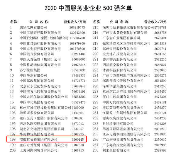 安糧集團位列2020中國服務業企業500強第198位