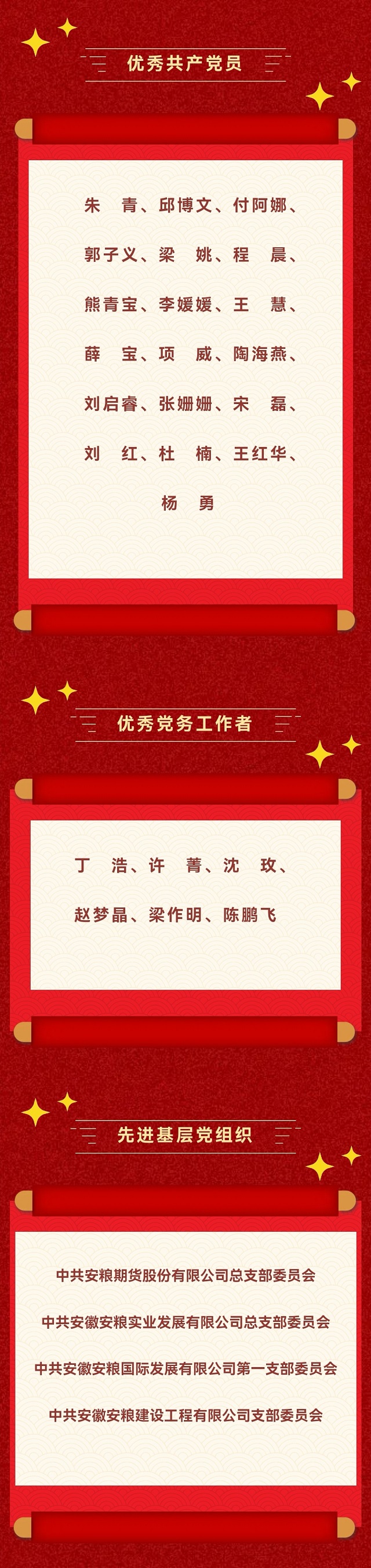 為大力弘揚黨的優良傳統和作風,激勵各級黨組織和廣大黨員更加深刻地領悟“兩個確立”的決定性意義,更加自覺增強“四個意識”、堅定“四個自信”、做到“兩個維護”,努力營造見賢思齊、爭做先鋒的良好氛圍。近日,安徽國貿黨委對優秀共產黨員、優秀黨務工作者和先進基層黨組織進行了表彰,安糧集團19名優秀共產黨員、6名優秀黨務工作者和4個先進基層黨組織獲得榮譽。