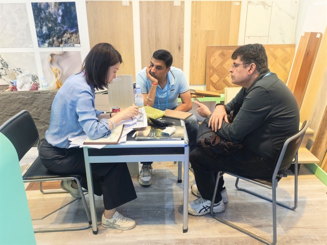 建材展區(qū)中,安糧以差異化策略布局全球市場。UV亮面墻板采用卡扣式快裝結(jié)構(gòu),安裝便捷、節(jié)省工時,深受東南亞客商青睞;為南美、中東定制的3D打印花色與鎏金花紋墻板,支持紋樣和尺寸個性化定制,滿足高端空間的獨特審美。