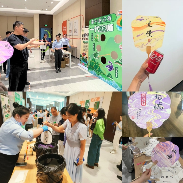 5月29日,在公司餐廳開展的“仲夏奔赴?美味出粽”端午趣味活動,吸引了眾多員工熱情參與。活動現(xiàn)場最具人氣的“端午射五毒”游戲,參與者手持弓箭瞄準背景板上的蛇、蝎等“五毒”圖案,在體驗傳統(tǒng)民俗競技樂趣的同時,寄托驅邪避毒、祈福安康的心愿。同步開展的非遺漆扇制作活動讓員工通過親手創(chuàng)作進一步深化對非遺文化的認知。成品扇子上,“山海”“無憂”“且慢”等字樣與端午元素、傳統(tǒng)書法相映成趣。